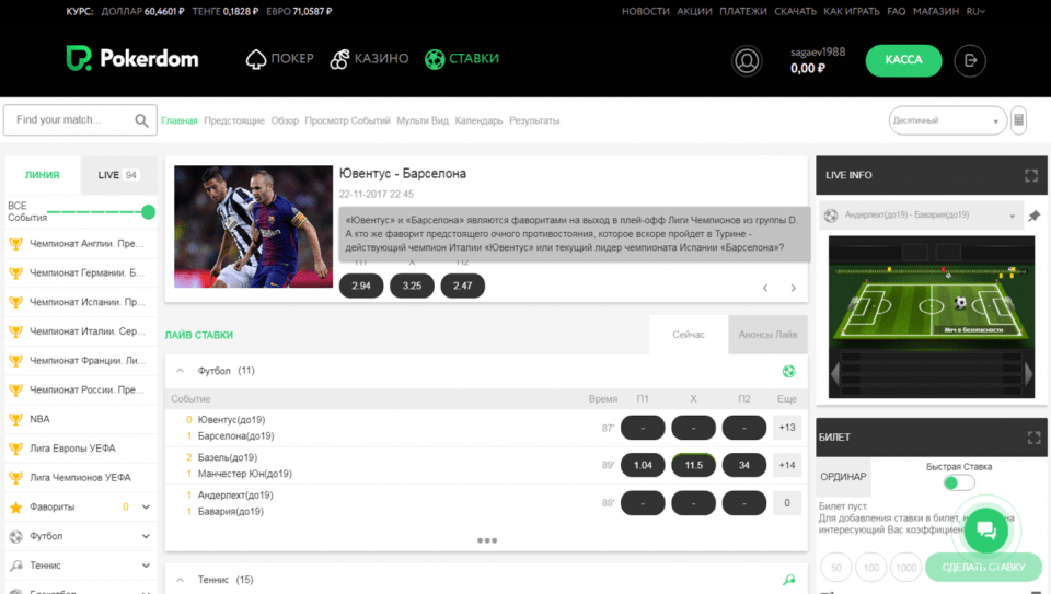 Общее количество дисциплин в БК ПокерДом приближается к двум десяткам. Здесь нет большого выбора экзотики, однако популярный спорт представлен довольно обширно. Наиболее подробно освещен футбол, хоккей, баскетбол и теннис. Футбольные события представлены не только высшими эшелонами, но и любительскими и локальными турнирами.