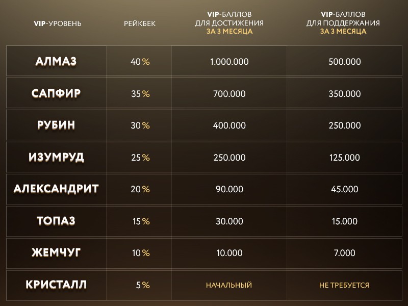 Александрит. Чтобы взойти на четвертую ВИП-ступень, квартальным достижением пользователя должны стать 200 тысяч очков. Сохранить за собой статус можно, набрав 100 000 поинтов. Данный уровень позволяет получать 2 балла за каждый рубль рейка и возврат в размере 20%.